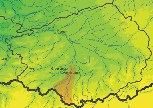 (kaartfragment links: eigen bewerking van www.atlas-belgique.be/index.php/nl/digitale-atlas/; Het bekken beheersplan van het Demerbekken (2008-2017). Leuven. D/2009/6871/011)